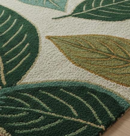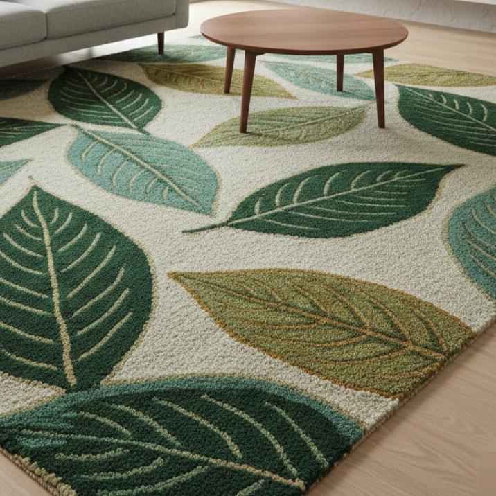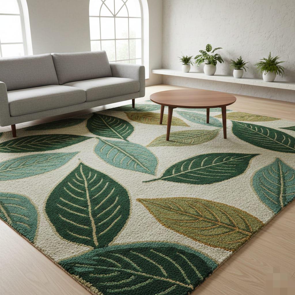 Wool Area Rug – Botanical Leaf Design, Modern Green Carpet